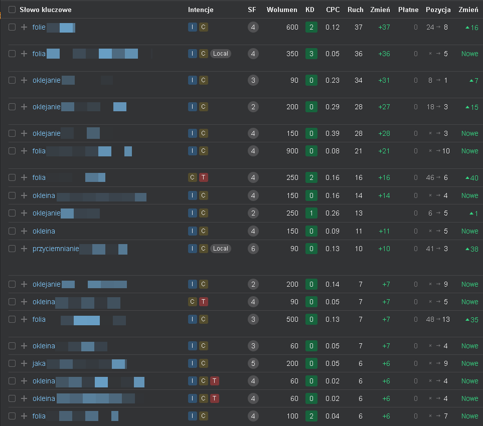 Powyższy zrzut ekranu pokazuje, że główne czynniki takie jak CTR czy ogólna pozycja fraz także uległy poprawie. Do wzrostu CTR mocno przyczyniają się takie elementy, jak poprawne zoptymalizowanie meta tytułów i meta opisów. Poprawa średniej pozycji została dodatkowo wzmocniona link buildingiem, co przekłada się na autorytet całej domeny, a co za tym idzie, średniej pozycji fraz.