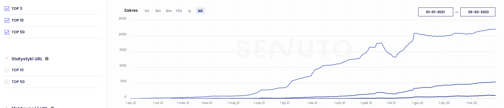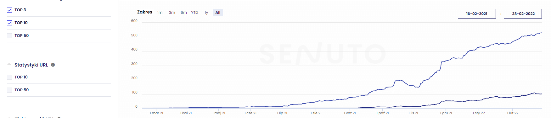 Jak widać, widoczność w zakresie TOP 50 stale rośnie. Podobna sytuacja ma miejsce w przypadku TOP 10 oraz TOP 3 – pierwsze wzrosty w zakresie TOP 10 udało się zauważyć już na przełomie czerwca i lipca 2021. W sierpniu 2021 zauważyliśmy pierwsze słowo kluczowe w TOP 3 wyników wyszukiwania: