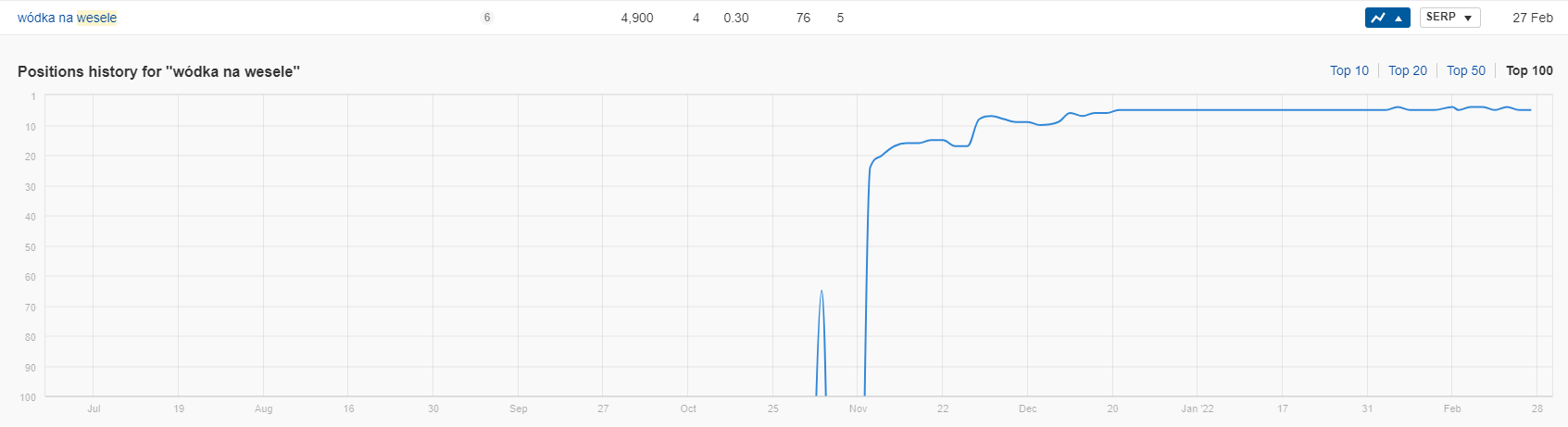 Dzięki zmianie znaczników title udało się uzyskać wysoką pozycję na frazę “wódka na wesele”, która była jedną z kluczowych dla klienta: