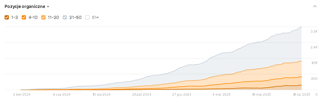 Od początku wdrożenia audytu na stronie zaczął występować trend wzrostowy, który od czerwca 2024 roku zaczął przyśpieszać. Nawet aktualizacje algorytmu czy wprowadzanie AI Overview nie zaburzyło tego trendu. Warto zauważyć, że frazy w swoich przedziałach TOP3, TOP10, TOP20 i TOP50 rosną w równomiernym tempie.