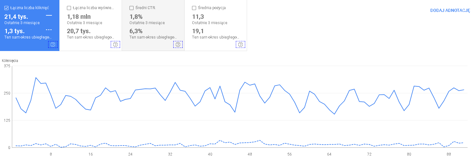 W przeciwieństwie do kampanii PPC, SEO wymaga nieco więcej czasu, ponieważ Google musi odpowiednio obliczyć pozycje fraz i umieścić stronę w stronach wyszukiwania. Z drugiej strony jest to ruch, który nie znika po zatrzymaniu działań marketingowych, a zostaje z nami nawet po ich zakończeniu. Cierpliwość jest tutaj cechą kluczową, ale i często bardzo opłacalną. W statystykach porównujących ilość kliknięć w ostatnich 3 miesiącach do roku poprzedniego, w tym samym okresie udało się osiągnąć wzrost wizyt na stronie o 1546%.