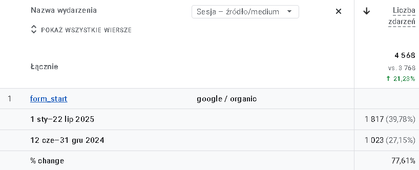 Dodatkowo prowadziliśmy działania link buildingowe, wspierające frazy o największym potencjale konwersji i zwiększające autorytet strony w oczach wyszukiwarki. Prace te były realizowane równolegle z optymalizacją techniczną i regularnym monitoringiem efektów w narzędziach analitycznych.